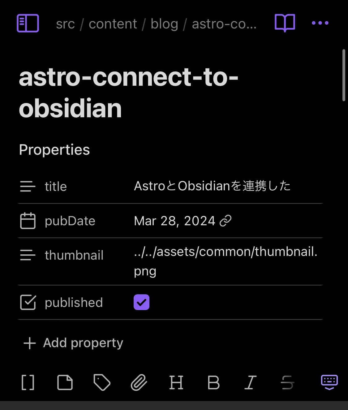 Obsidianから書いたものはmdファイルになるのも都合が良いです。他にもファイルの先頭にメタデータが必要なのですが、